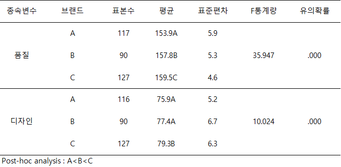 디자인은 A사와 B사가 동일 집단으로 속하였지만, C사는 나머지 브랜드 사와 유의한 차이가 있는 것으로 나타났습니다.