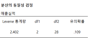 <분산의 동질성 검정>의 Levene통계량을 이용하여 분산의 동질성에 대해 검정한 결과를 보면 P-value는 .109로서 등분산 가정에 문제가 없습니다.