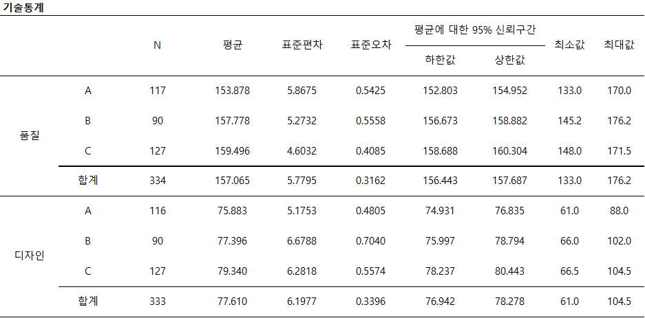<기술통계>를 보면 품질은 평균이 올라감에 따라 감소하고, 디자인에 대한 표준편차는 B사가 다른 브랜드에 비해 약간 크게 나타났습니다.