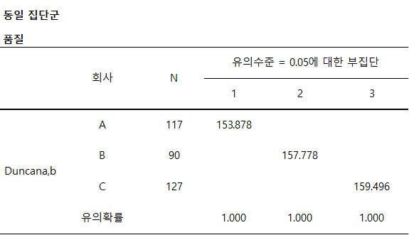 B와 C사의 품질은 유의한 차이를 보이지 않았습니다.