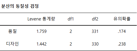 <분산의 동질성 검정>을 보면 품질과 디자인 모두 .05보다 크기 때문에 등분산의 가정이 충족되었습니다.