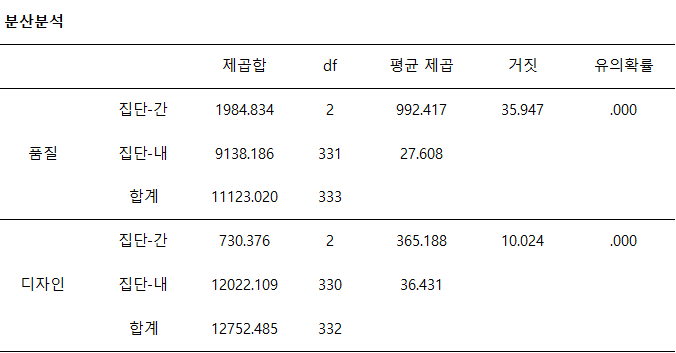 <분산분석>표를 품질과 디자인의 집단-간 유의확률이 .000으로 매우 유의하게 나타납니다.