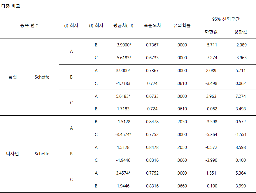 품질과 디자인에 대하여 Scheffe와 Duncan의 결과는 약간 다릅니다.
