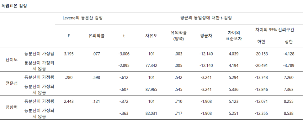t통계량의 양쪽 유의확률은 0.003이고 유의수준 범위에 있으므로, 남자와 여자의 난이도 점수는 차이가 난다고 판단할 수 있습니다.