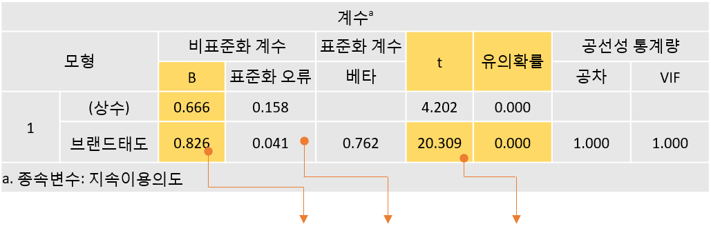 • 상수는 .666, 브래드태도 계수는 .826 → 지속이용의도 = .666+.826×브랜드태도