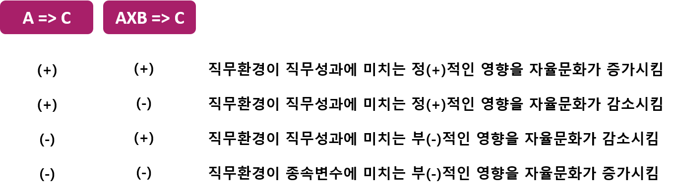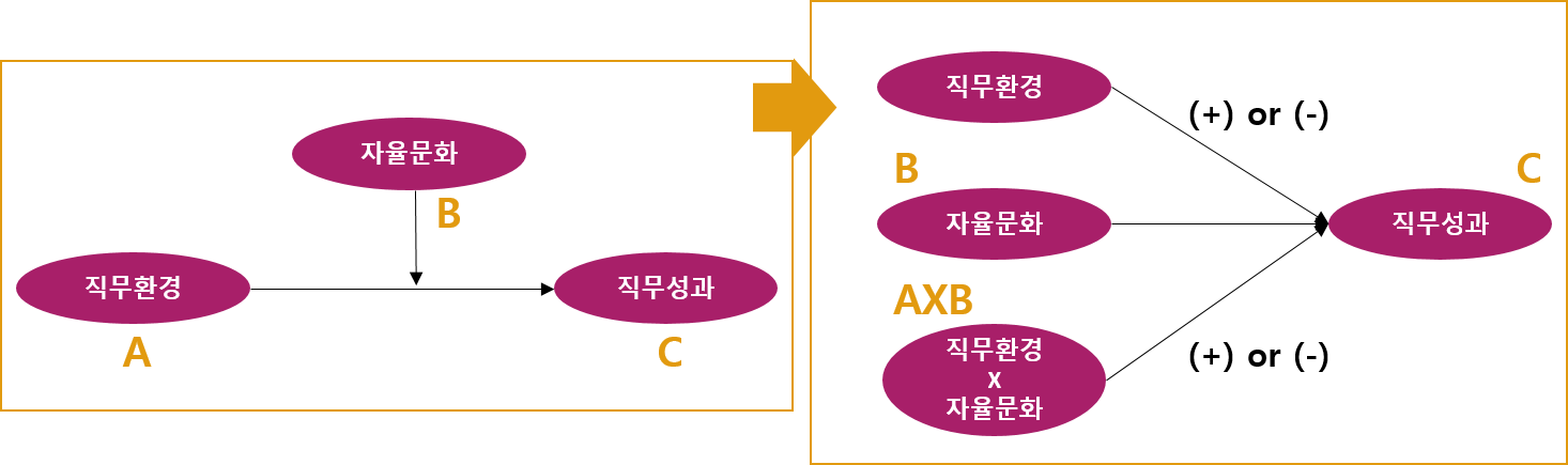 두 가지 유형의 조절효과 분석방법을 예로 들어보겠습니다. 기업에서 직무환경이 직무성과에 미치는 영향을 검증한다고 하면, 여기서 자율문화를 조절변수로 사용하기로 가정합니다.