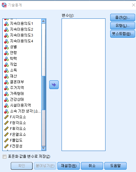 - 평균중심화: 변수의 점수 – 변수의 평균 (변환 – 변수계산에서 변경)