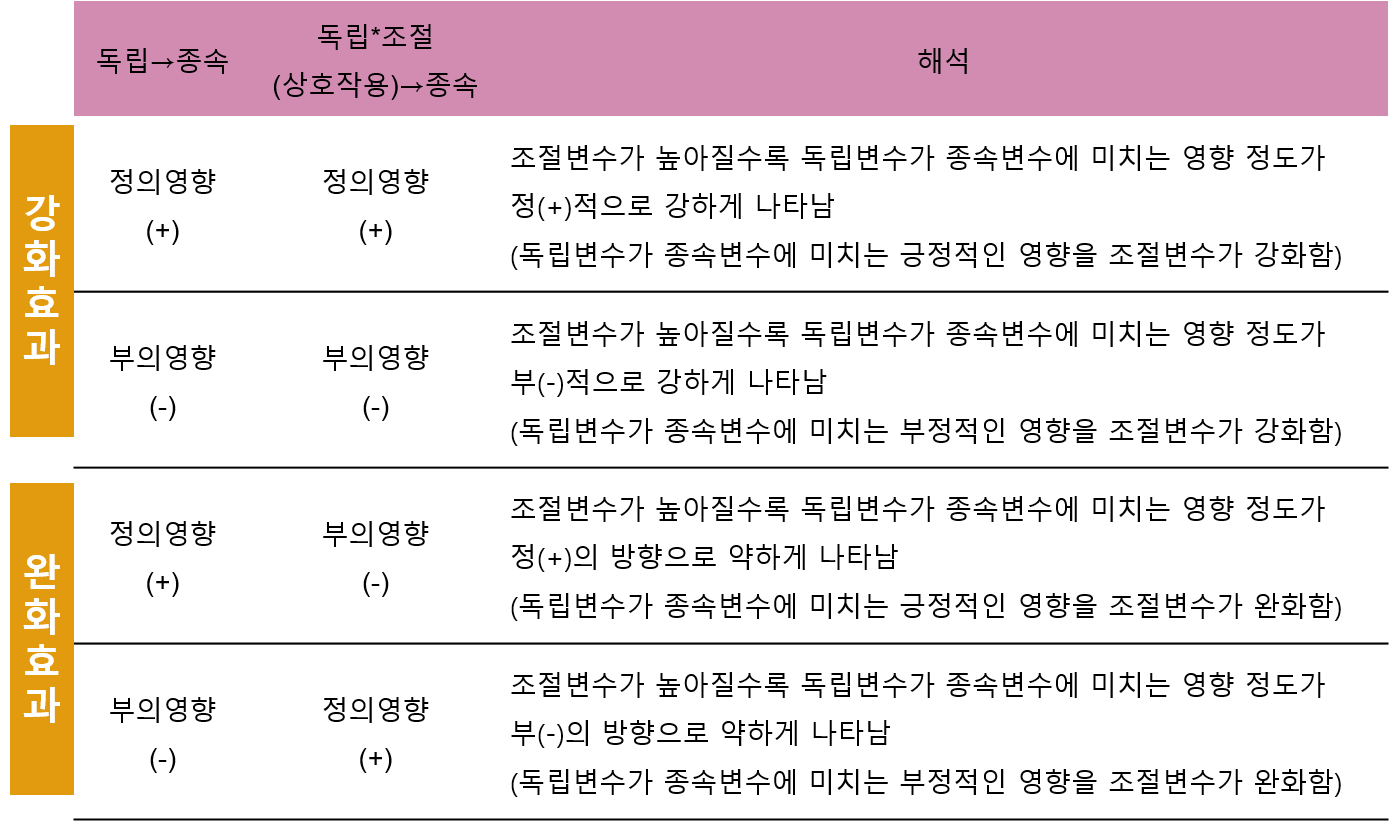 - 조절변수는 독립변수와 상호작용하여 변수 간의 관계를 강화 혹은 약화시키거나 관계의 방향을 바꾸기 때문에 상호작용효과라고 함