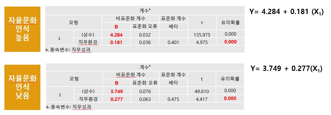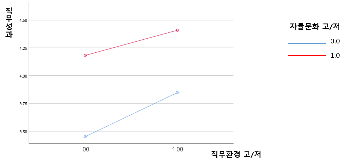 ※ 직무환경이 직무성과에 미치는 영향력은 자율문화 인식이 낮은 집단에서 더 큼