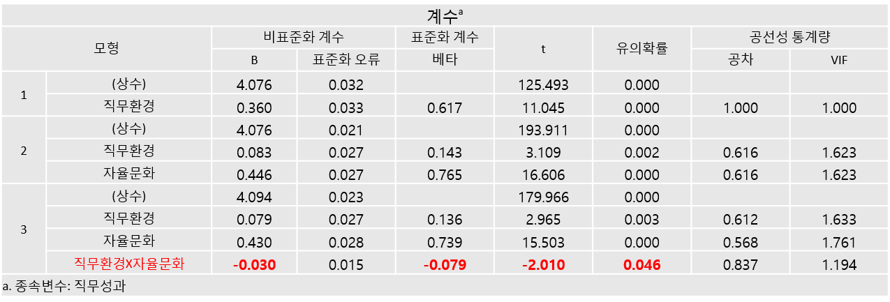 - 직무환경과 자율문화의 상호작용항은 유의확률 .046으로 유의수준 .001에서 유의함