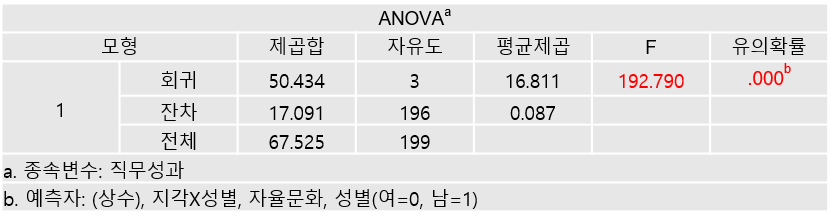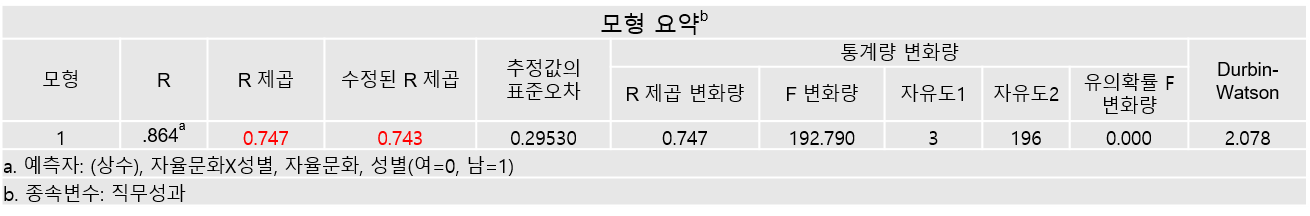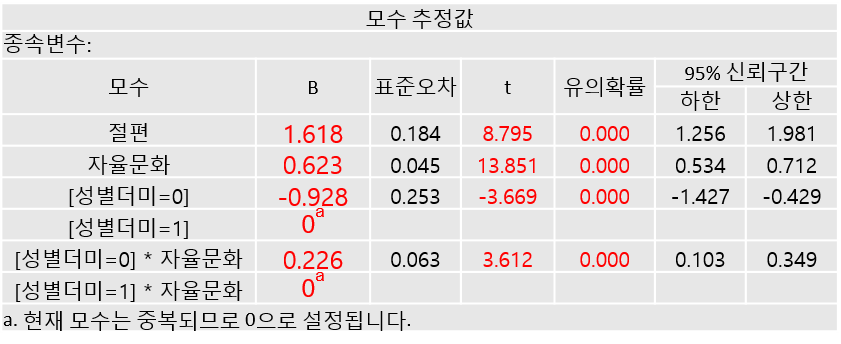 직무성과 = 0.691 + 0.849(자율문화) +0.928(성별) - 0.226(자율문화X성별)