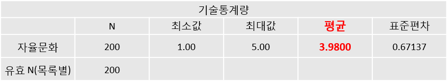 - 자율문화(조절변수)의 기술통계 분석으로 평균 확인