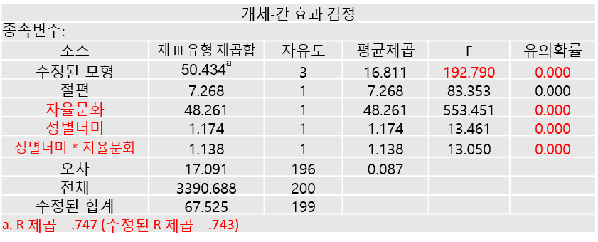 - 모형(자율문화, 성별, 자율문화X성별 투입)