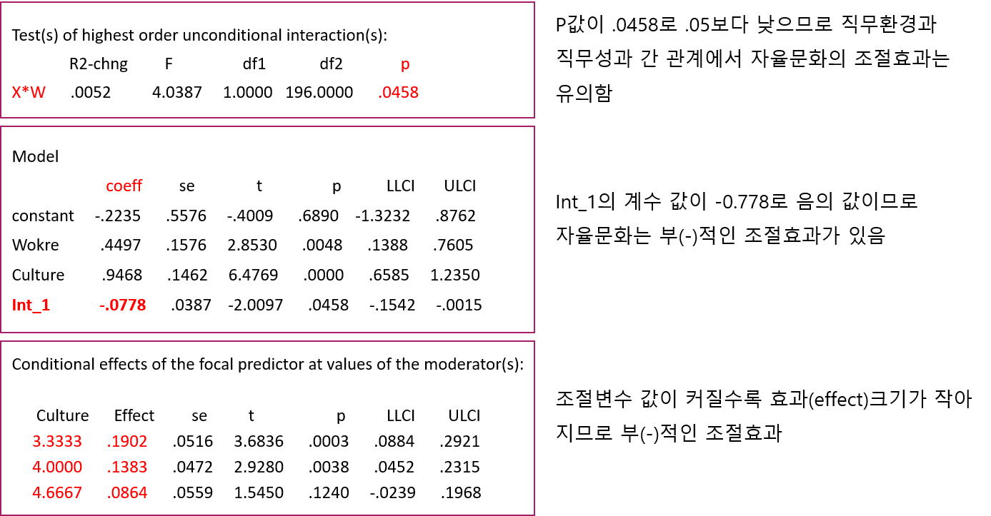- 따라서 자율문화는 직무환경과 직무성과 간 관계에서 조절효과가 있음