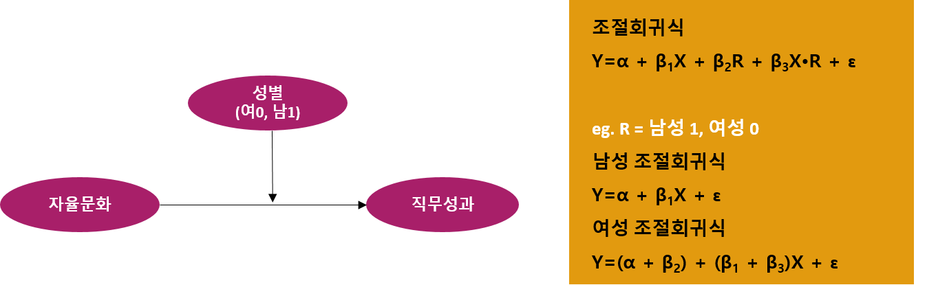 보통 독립변수와 종속변수는 연속형 변수로 많이 쓰이는데 조절변수는 집단을 나타내는 명목형(범주형) 변수와 연속형 변수 모두 가능하다. 범주형 자료일 때 가장 많이 쓰이는 조절변수가 일반적 특성인데 대표적으로 성별이 있다. 이번에는 자율문화를 독립변수로 하고 성별을 조절변수로 하여 직무성과에 미치는 영향을 예시로 들었다.