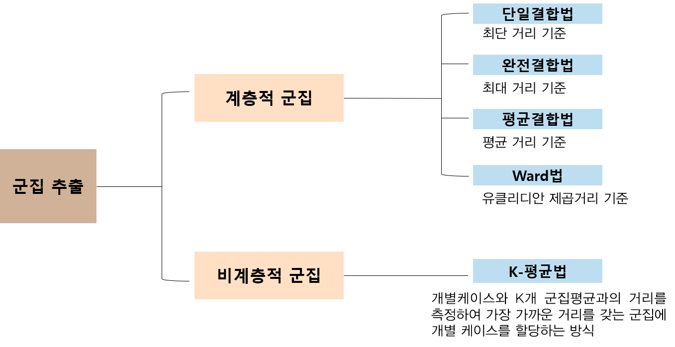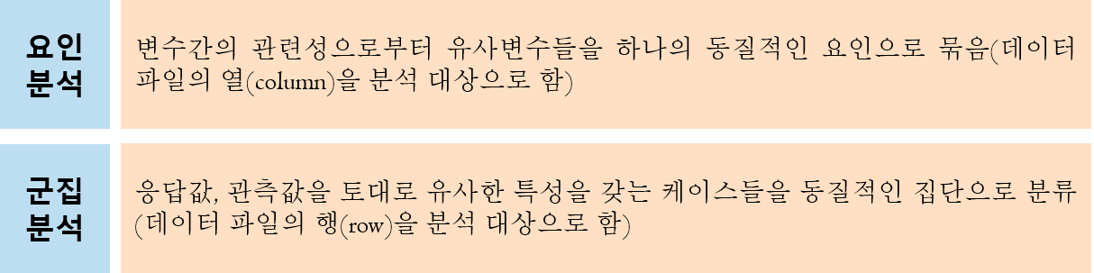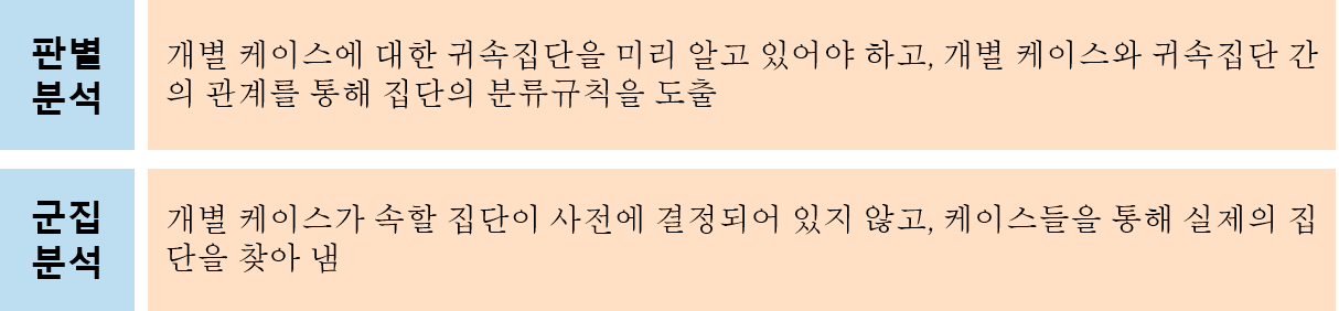 - 군집 내 분석대상들은 서로 동질적인 특성, 군집 간에는 이질적인 특성