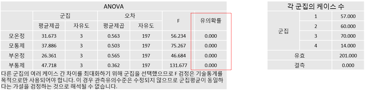 - 각 군집화 변수를 종속변수로 하여 새롭게 생성된 군집을 나타내는 명목척도의 변수를 독립변수로 하여 분산분석을 한 결과