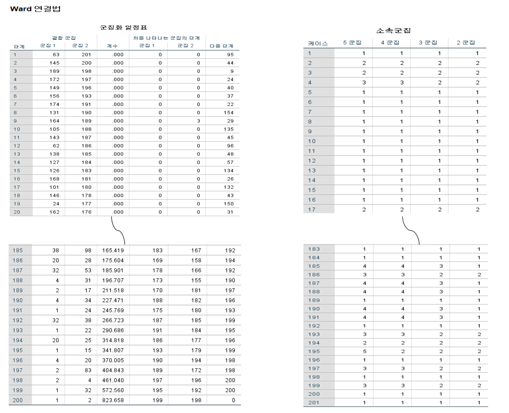 - 군집의 수가 4개일 경우, 3개일 경우, 2개일 경우에 각 응답자가 어느 군집에 속하는지를 보여줌