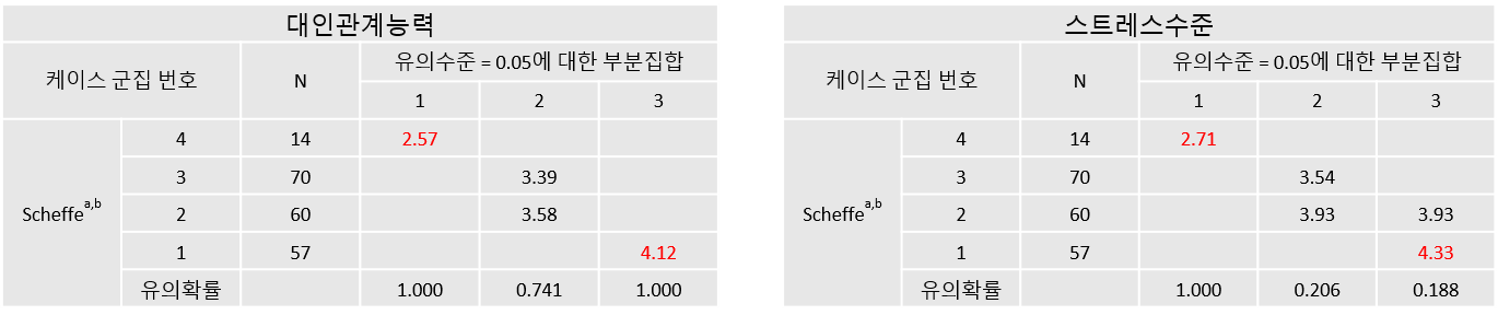 - 대인관계능력과 스트레스수준에서 군집별 평균차이가 통계적으로 유의함