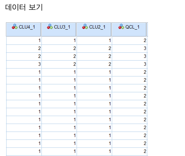 - 분석할 때 (저장 – 옵션_해법범위)를 지정해 주었기 때문에 군집분석결과가 새로운 데이터에 저장됨