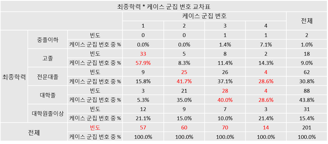 - 군집에 따라 최종학력은 통계적으로 유의한 차이가 있음