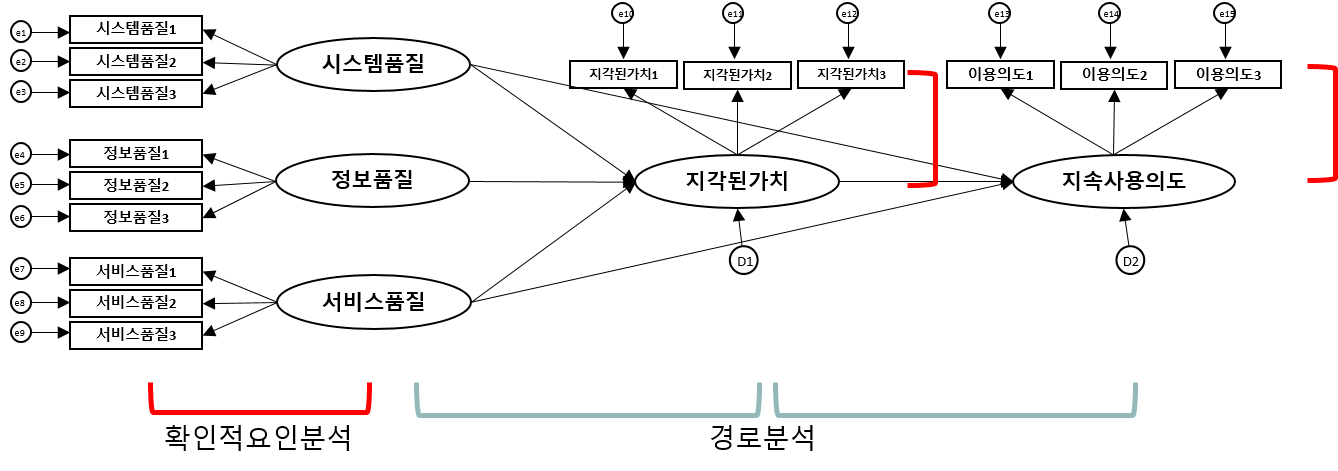 - 확인적 요인분석과 변수 간 복잡한 인과관계를 알아보는 경로분석이 결합된 방법론