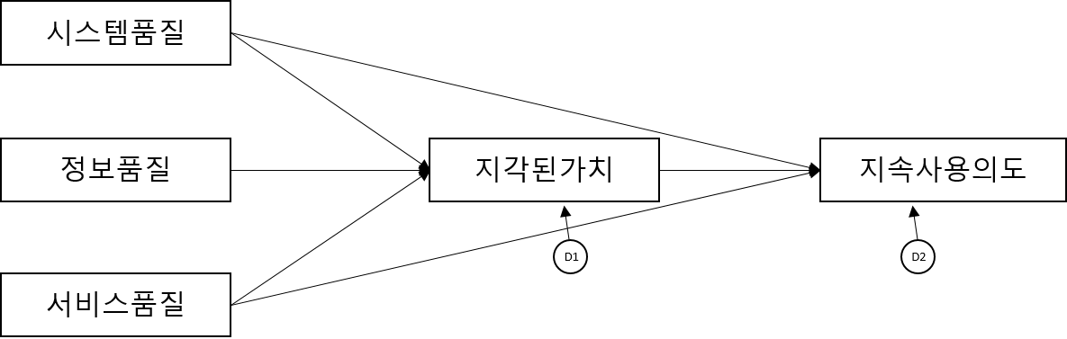 위 모형을 회귀분석 검정 한다면 시스템, 정보, 서비스품질과 지각된 가치, 그리고 시스템, 정보, 서비스품질과 지속사용의도 간 다중회귀분석, 지각된 가치와 지속사용의도 간 단순회귀분석으로 세 번을 해야 한다. 매개효과 검증까지 한다면 4번의 과정을 거쳐야 한다. 분석의 번거로움도 있지만, 모형의 변수가 동시에 반영되지 않아 사실적이고 종합적인 분석이 어렵다. 그래서 모형의 구조적 영향 관계를 통합적으로 분석할 수 있도록 구조방정식을 사용한다.