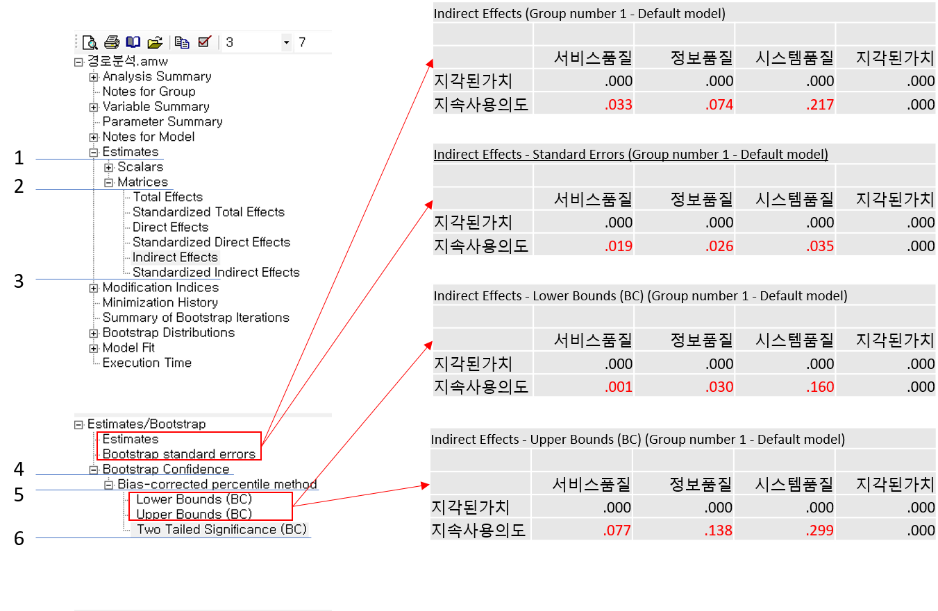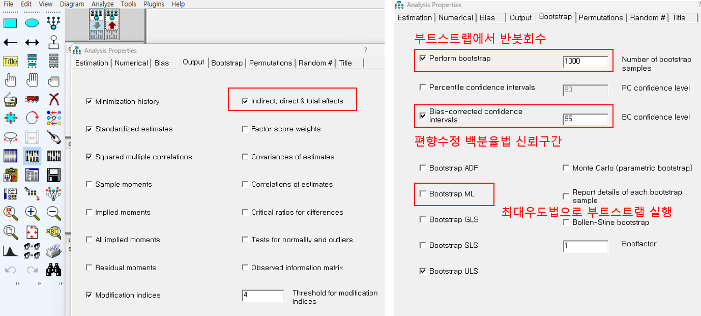 신뢰구간에 대해서 백분율법(percentile method)과 편향수정 백분율법(bias corrected percentile method)을 제공한다. 백분율법은 편향이 거의 없는 경우에 사용된다. 편향수정 백분율법은 편향을 수정한 방법으로 bias(편의)가 크게 존재할 경우에 사용한다. 편의는 예측치가 실측치에 비해 치우쳐 있다라는 의미로 실제의 상태와 다르게 나타나는 평균적 차이라고 생각하면 된다. 우리가 주로 사용하는 것은 편향수정 백분율법이다.