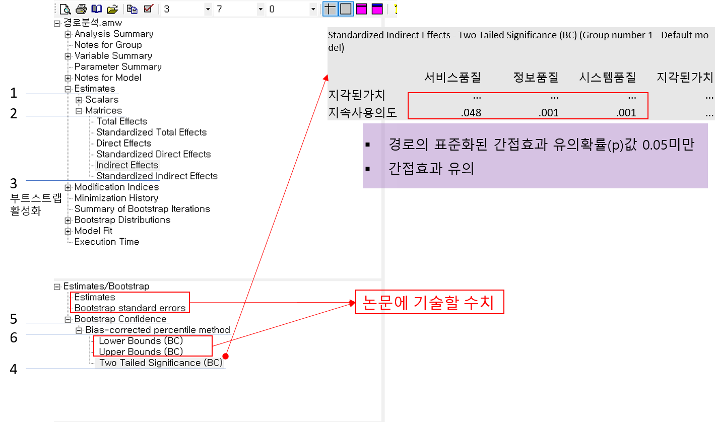 5% 신뢰구간에 0을 포함하지 않으면 유의하지 않은 이유는 살펴본다. 신뢰구간이 마이너스값에서 플러스 값 사이에 값을 보인다면 0을 포함한다는 것이고 이것은 영향력이 + 혹은 – 가 될 수 있다는 뜻으로 영향력이 유의하지 않은 것이다. 그리고 신뢰구간이 상한 하한으로 구분되는 것은 반복적 작업을 하는 부트스트래핑을 했기 때문이다. SPSS를 이용한 프로세스 매크로도 부트스트래핑이 적용되기 때문에 상한 하한이 나타난다. 반면에 다중매개효과분석을 통해 소벨테스트로 매개효과 검증을 할때는 신뢰구간 개념이 없어서 매개효과의 유의성과 간접효과 영향력을 표기한다.