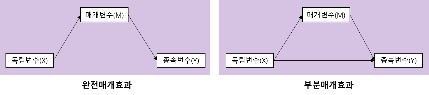 - 독립변수가 종속변수에 직접 영향은 없지만 매개효과 유의할 때 완전매개