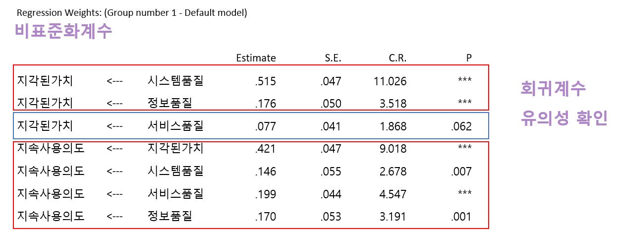 - 서비스품질 → 지각된가치 경로는 유의확률 0.062이므로 유의수준 0.1로 할 때 매개효과 있음을 분명히 기술해야 함