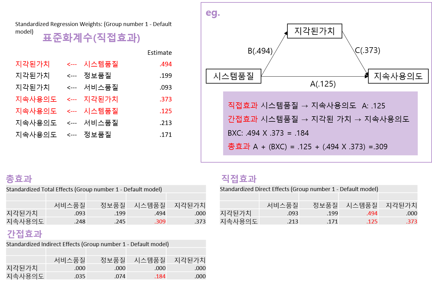 - 독립변수에서 종속변수로의 직접경로와 매개변수를 경유한 간접경로 유의성 확인