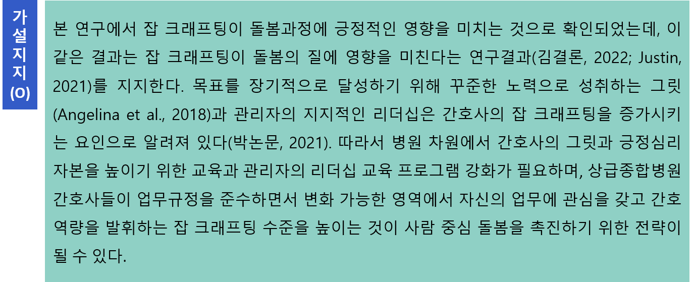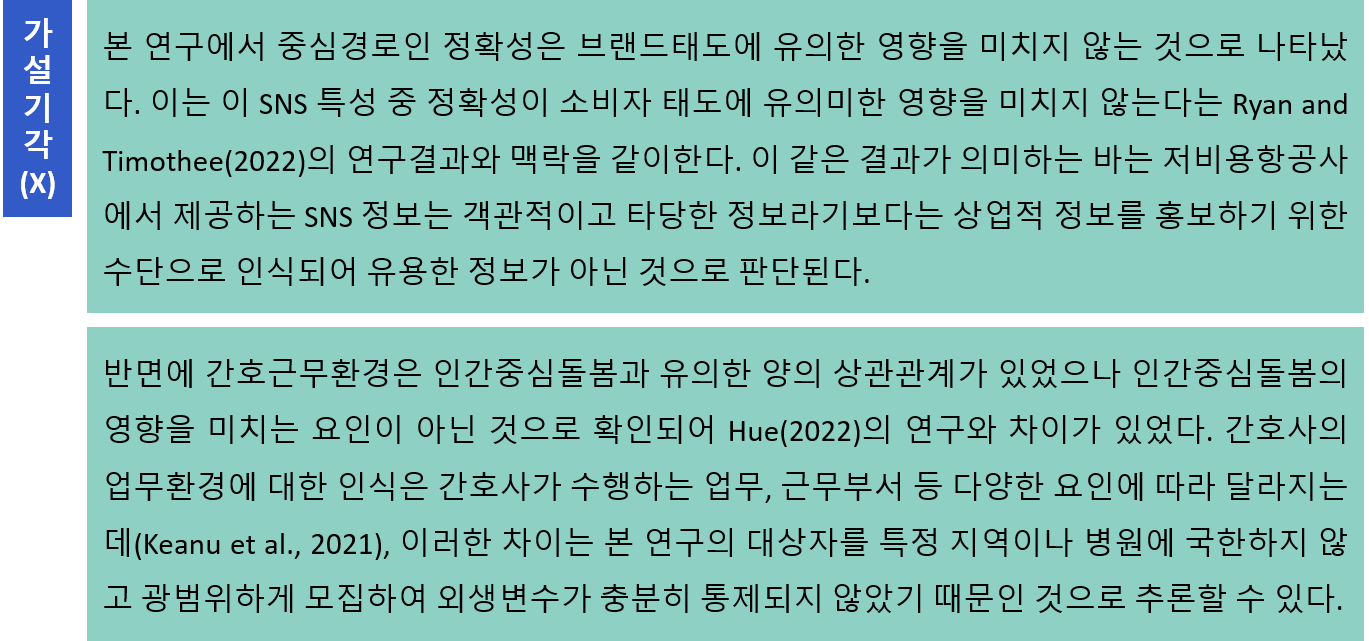 - 선행연구와 다른 분석결과(기각)에 대해서는 표본의 특성, 변수에 대한 조작적 정의가 대부분 다르므로 이에 대한 내용으로 기술