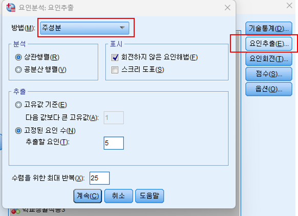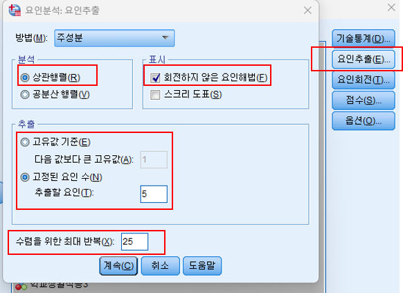 - 요인 추출에 대해 25회의 최대반복계산을 수행한다는 의미, 최대값을 달리 지정 가능