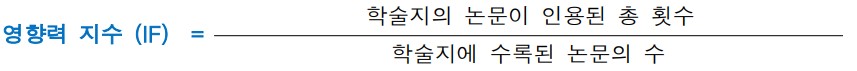 즉, 논문의 인용횟수가 많을수록 해당 논문의 영향력이 높다고 평가되고, 영향력 지수가 높은 학술지는 해당 분야에서 권위 있는 학술지로 인정받는다고 할 수 있다. KCI IF는 전체 분야 평균으로 0.84인데 사회과학이 평균 1.43으로 다른 분야에 비해 높다.
