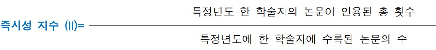 즉시성지수(II)는 저널의 논문이 인용에 걸리는 시간 또는 저널에 수록된 논문이 당해 연도에 인용되는 빈도를 측정, 얼마만큼 빨리 인용되는지를 나타낸다. 특정년도 한 학술지의 논문이 인용된 총 회수를 특정년도에 한 학술지에 수록된 논문의 수다.