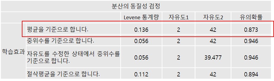 • P>.05 : 분산이 동일(p값이 유의확률보다 크기 때문에 분산의 동질성은 만족함)