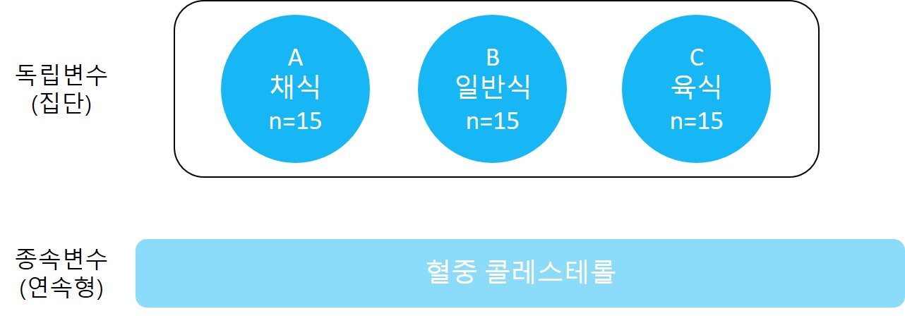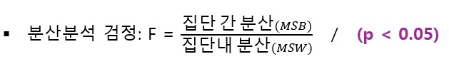 • 독립변수로 구분되는 3개 이상의 각 집단 간 종속변수의 평균들이 통계적으로 유의하게 차이가 있는가를 검정