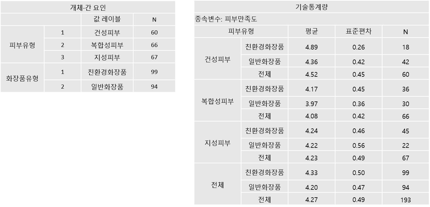 화장품유형 간 및 피부유형 간 피부만족도 차이에 대한 검정은 집단을 구분하는 두 변수가 각각 피부만족도에 미치는 영향을 검정(다른 변수의 영향은 고려하지 않음)
