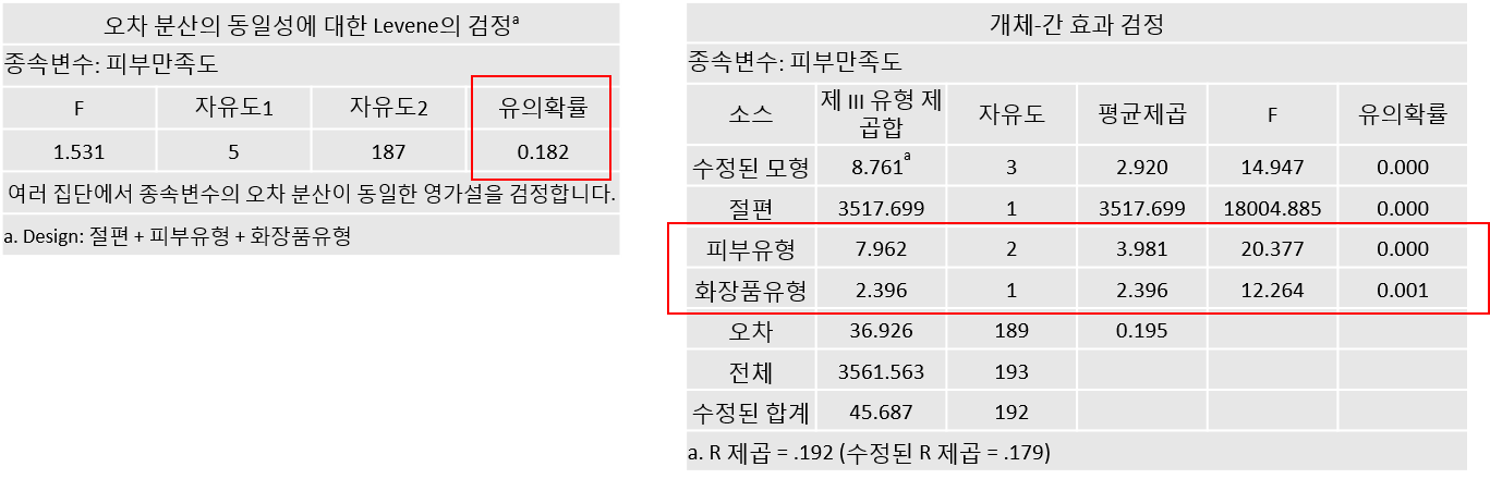 ⇒ 화장품유형(F=20.38, p<.05)과 피부유형(F=12.26, p<.05)에 따라 피부 만족도에 차이가 있음