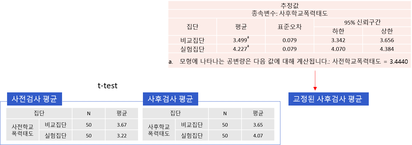 사전검사를 통해서 집단 간 동질성 여부를 확인해야 하고 동질성 여부가 입증되면 그대로 t검정이나 분산분석을 실시하면 된다. 그런데 사전검사 결과 각 집단간의 차이가 있다면 프로그램 같은 처치변수로 영향을 받는지 확신할 수 없다. 그래서 사전검사를 통제하는 공변량으로 투입한 공분산분석을 시행해야 한다.