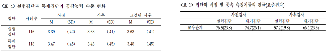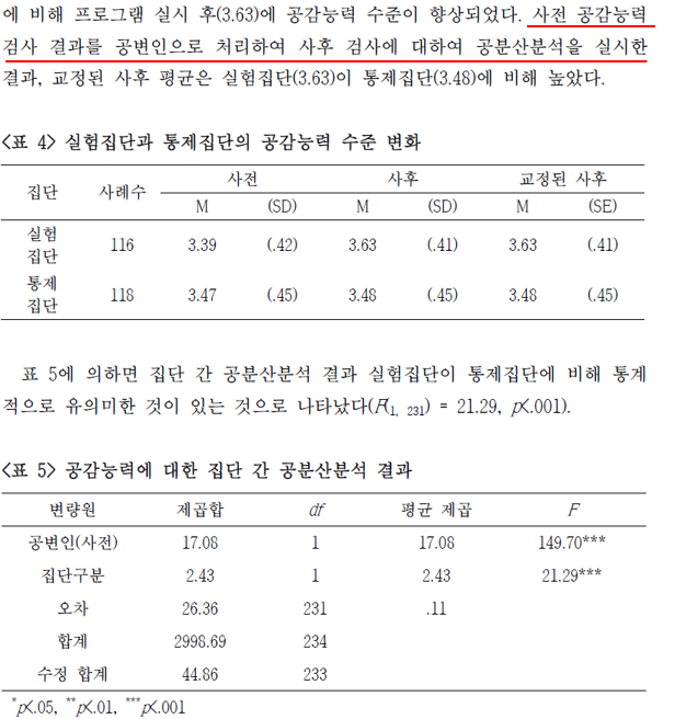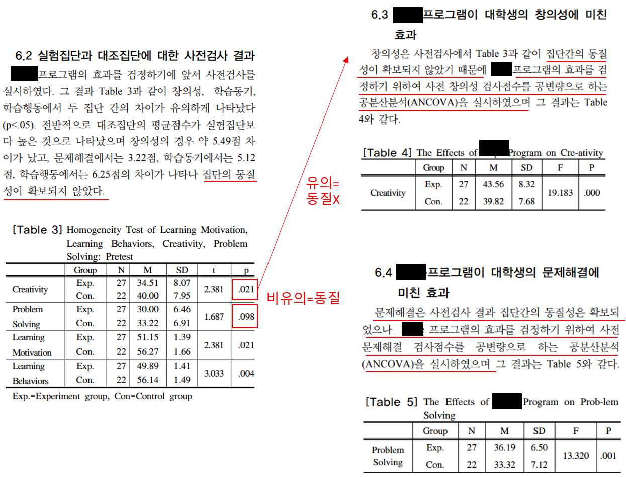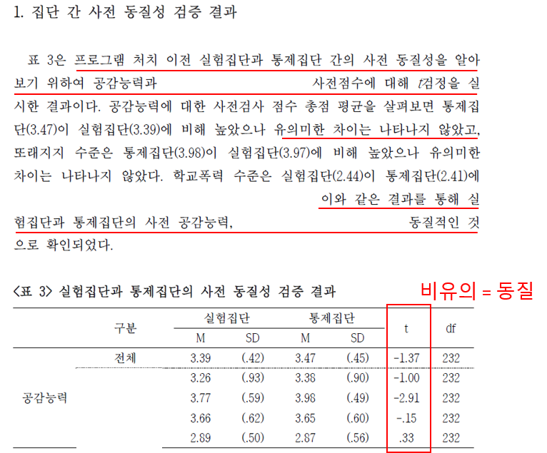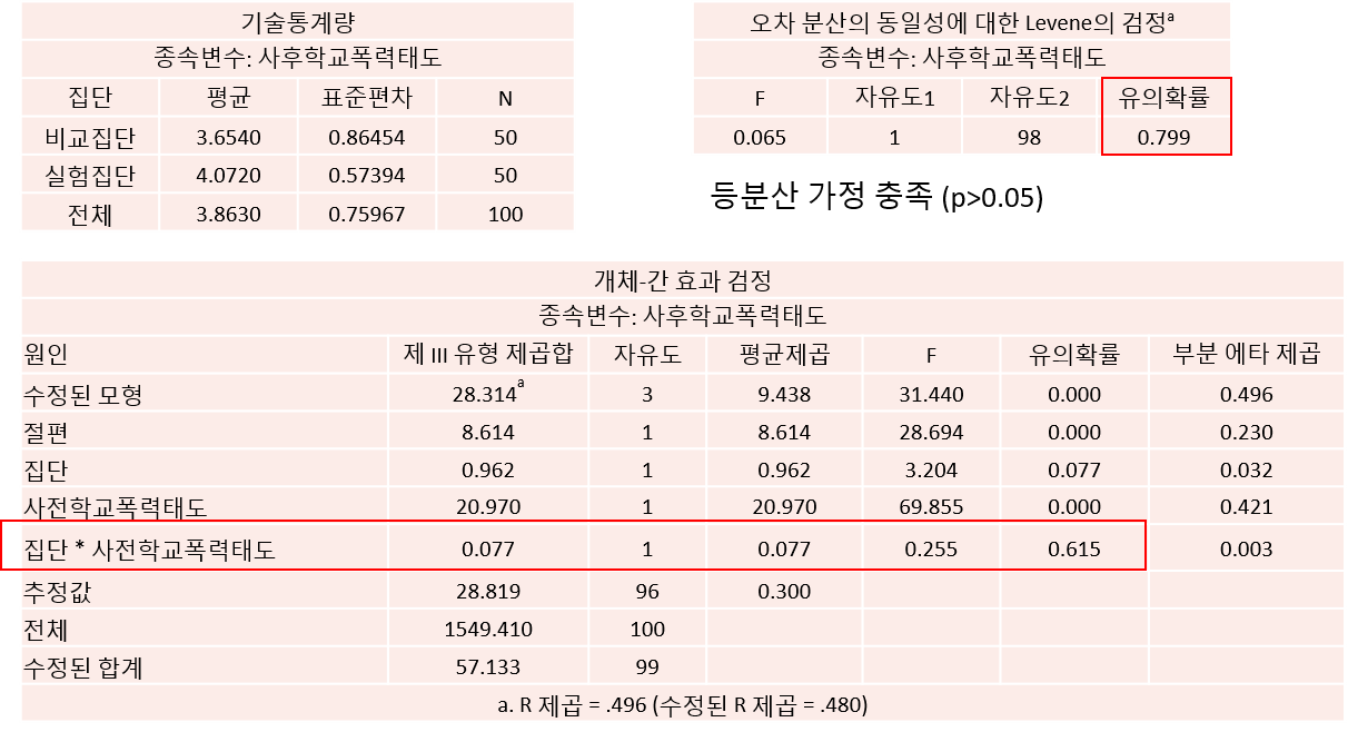 일반적으로 공분산분석을 하기 전 사전검사 점수의 집단 간 차이가 유의하지 않아야 한다는 논문이 많다. 그럼 사전검사가 통제될 필요가 없다. 그럼 대응표본 t-test나 반복측정분산분석을 하면된다. 그런데 내 관점은 사전검사 점수의 차이가 유의미해야 공분산분석을 하는 것이 맞다고 본다. 사전검사 점수 차이는 프로그램 효과의 중요한 정보가 될 수 있다. 만약 실험집단과 비교집단의 사전 수준에 차이가 있다면, 이는 프로그램 실시 전 두 집단의 학교폭력태도의 차이를 반영하는 것이다. 이런 정보는 프로그램의 효과를 해석하는데 중요한 단서가 될 수 있는데 공분산분석을 통해 사전 차이를 통제할 수 있다. 즉, 사전검사 점수의 차이가 있어야 공분산분석을 통해 이 차이를 통제할 수 있고, 이를 통해 순수한 프로그램 효과를 확인할 수 있다. 따라서 프로그램효과 검증 연구에서는 사전검사 점수의 집단 간 차이가 유의하다면 오히려 이러한 차이를 공분산분석을 통해 사전검사를 통제하는 것이다. 다만 어떤 경우든 공분산분석의 기본 가정(예: 종속변수의 정규성, 등분산성 등)은 충족되어야 한다. 서로 다른 논문의 예로 확인해보자.