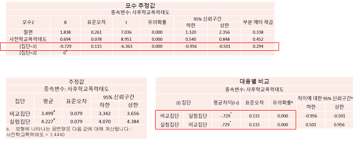 • 비교집단과 실험집단 사후검사의 평균은 학교폭력태도의 사전검사가 통제된 후에 0.729의 차이가 있음