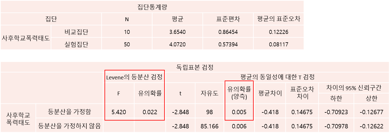 □ 분석 – 평균비교 – 독립표본 t 검정(학교폭력태도의 사후검사)