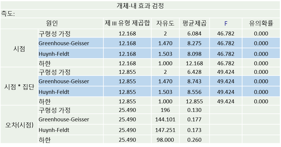 그런데 지금 유의확률이 .000으로 구형성 가정을 만족하지 못한다. 구형성 가정을 충족시키지 못하면 집단 간 차이가 없음에도 있다고 잘못 결론 내릴 수 있는 1종 오류가 커질 수 있다. 그래서 좀 더 보수적인 검증이 필요하기 때문에 엡실론의 값을 확인한다. 유의확률이 0.05미만으로 만족하지 못하면 그린하우스 게이서(Greenhouse-Geisser), 하인펠트(Huynh-Feldt)를 보면 된다. 구형성 가정 문제가 없다면 구형성 가정 출력결과를 보면된다. 그린하우스 엡실론 값이 0.75보다 크면 하인펠트의 결과를 이용하고, 그렇지 않으면 그린하우스의 결과를 이용하거나 이조차도 안되면 좀 전에 본 다변량 검정결과를 이용한다.