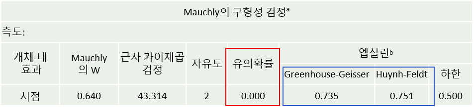 반복측정분산분석을 적용하기 위해서는 오차항의 공분산 행렬에 대한 구조가 모형에서 상정하고 있는 구조와 동일한지 여부를 검증해야 한다. 비록 동일한 집단에 대해 시점을 다르게 하면서 반복적으로 측정된 데이터이지만 모든 반복 횟수 간의 관련성 정도는 일정해야 한다는 의미이다. 이때 Mauchly(머출리)의 구형성 검증을 확인한다. P값이 0.05보다 커야지 구형성 가정을 만족한다. 쉽게 분산분석의 오차분산의 동질성 검증과 같은 개념으로 생각하면 된다.