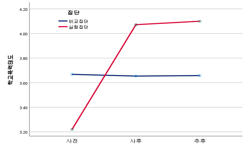 ▶ 프로그램의 효과는 집단과 시점에 따라 학교폭력태도에 차이가 있음