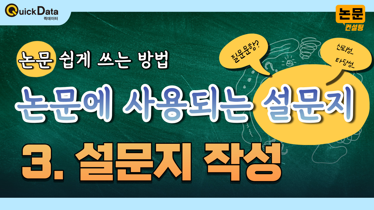 논문설문지의 질문 순서부터 사전조사, 구조방정식 분석을 위한 설문지설계까지 철저히 준비하는 것은 논문의 완성도를 결정짓는 핵심입니다. 설문지 설계가 어렵다면, 논문컨설팅 전문기업 퀵데이터의 도움을 받아보세요.