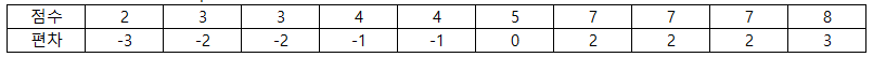 먼저 편차를 알아야 하는데 편차란 각 데이터가 평균값에서 어느 정도 떨어져 있는가를 나타냅니다.