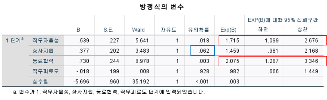 • 분류집단 예측력을 검증하기 위해 계수의 유의성 확인, 분석에서 직무자율성과 동료협력이 (+)으로 유의함